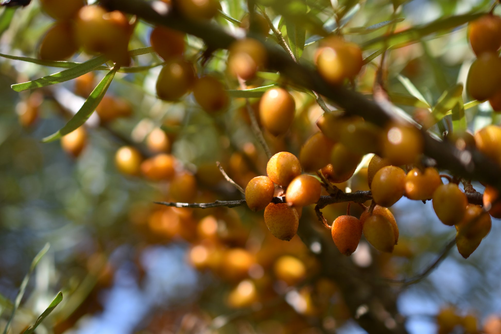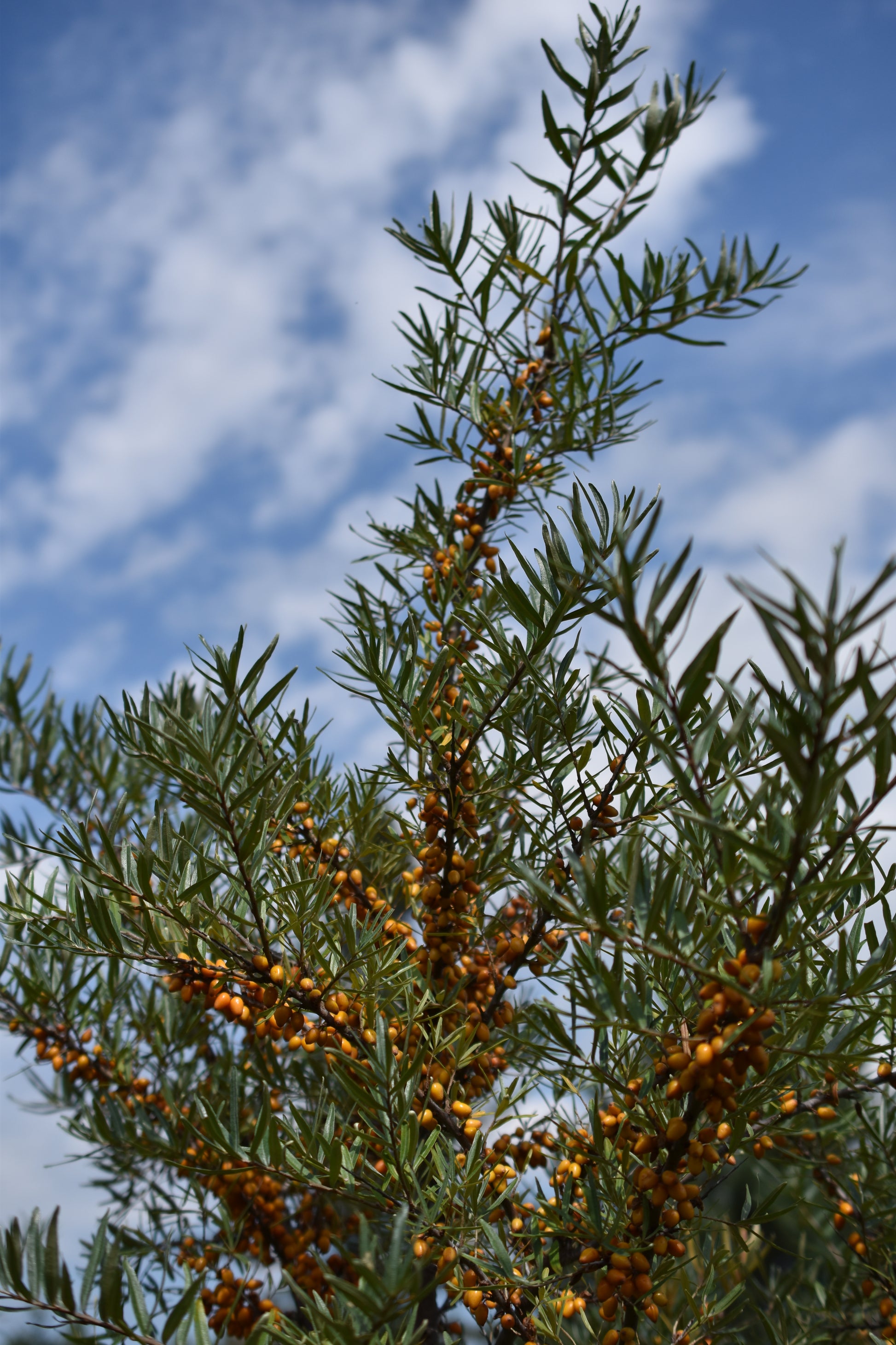Hippophae Rhamnoides - Le cultivar ‘Eva’ est une variété femelle recherchée pour sa production de fruits de calibre supérieur. En plus d’être gros, ses fruits ovales de couleur jaune ont le plus haut taux de polyphénols enregistré parmi les cultivars commercialisés au Canada. Ses feuilles larges et vertes foncées lui permettent de maintenir une excellente productivité de fruit jusqu’en zone 3. Cet arbuste a peu d’épines. La récolte s’étale sur 10 jours, 100 jours après la floraison.